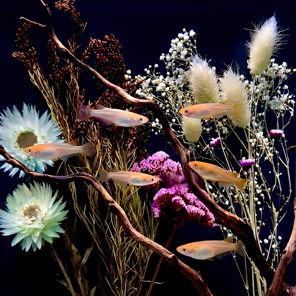💎 独自の革新技術「水景用フラワーオブジェ」 特殊なクリアコーティング技術により、ドライフラワーを最も美しい瞬間のまま封入。 水を汚さず、メンテナンスフリーで**「永遠の美」**を保ちます。