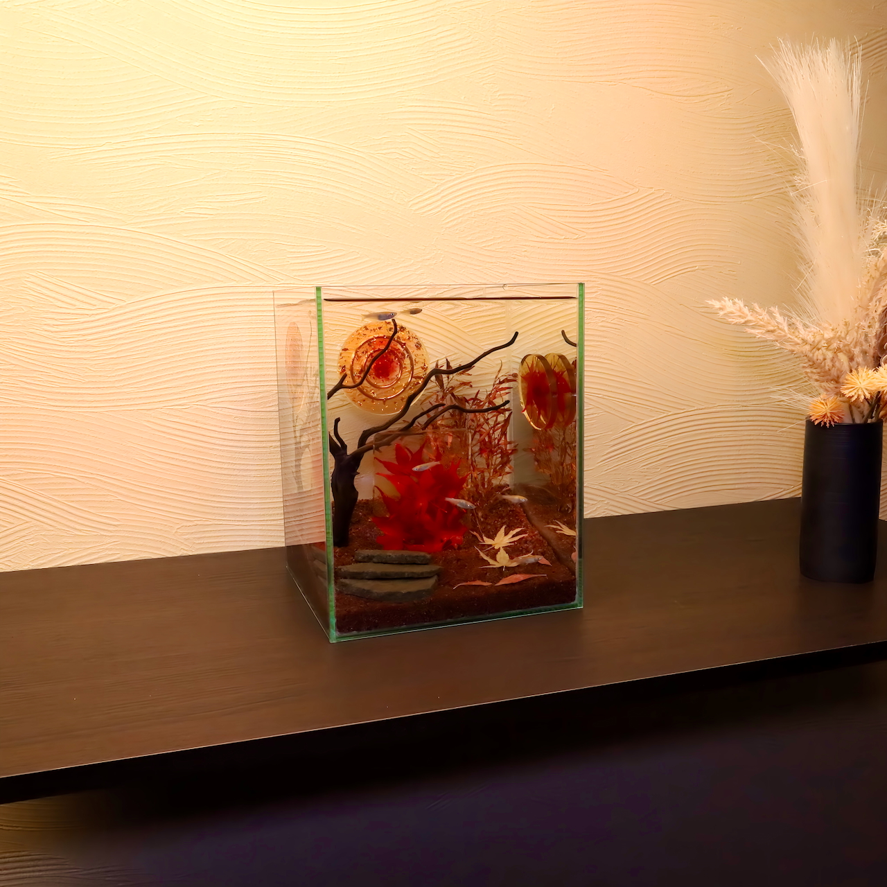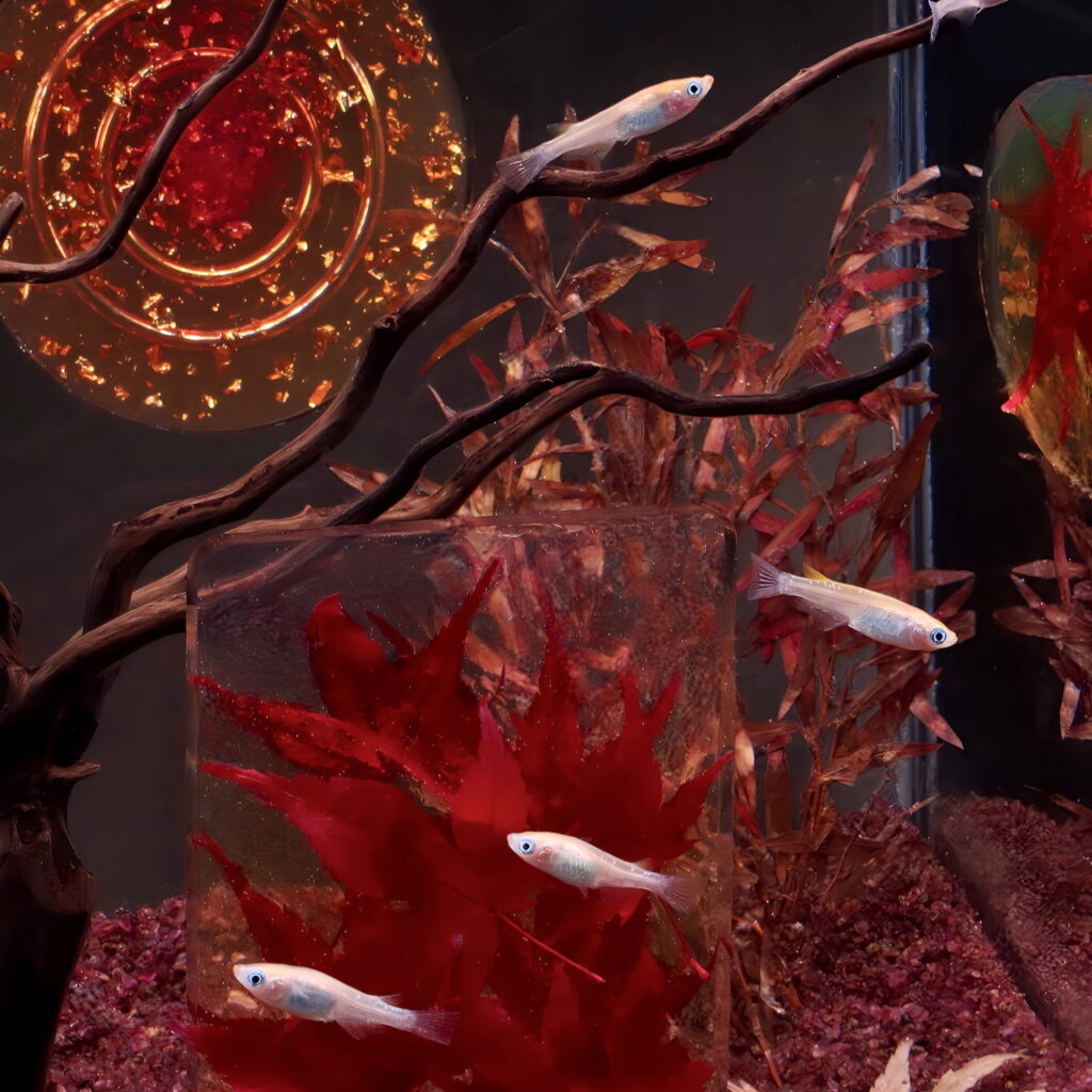 上品なガラス水槽に、紅葉色のリングオブジェと金箔の煌めきを添えた、